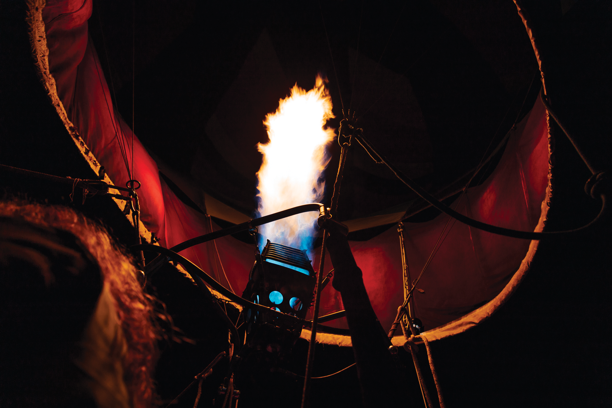 In this photograph, a hot-air balloon prepares to rise—its tiny basket suspended between earth and sky, carrying the weight of hope in a space barely big enough for one person. The flame at its center becomes the true subject: a living force of orange, amber, and scarlet red, flaring upward in a rush of heat and possibility. A hint of indigo kisses the metalwork, echoing the quiet tension between danger and beauty.